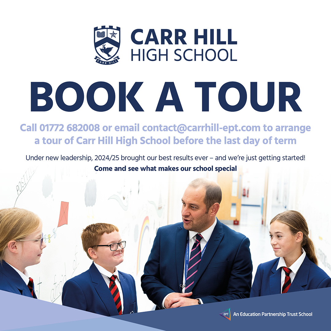 Carr Hill is a large 11-16 school of just over 900 students serving the Kirkham area. Our students come from a wide variety of primary schools into Year 7 and we are a very popular choice for families both local and slightly further afield. We hope you find a rich source of information here about our thriving school community.
